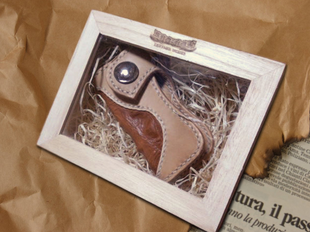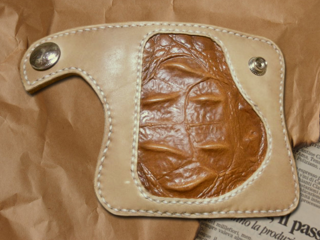 ナチュラルサドルレザーをベースに、キャメル色の本革クロコをインレイさせたキーケースです。 GKH-002とペアでオーダーいただきました。 オリジナルのカットラインがなんともワイルド!