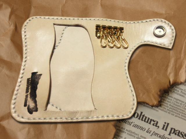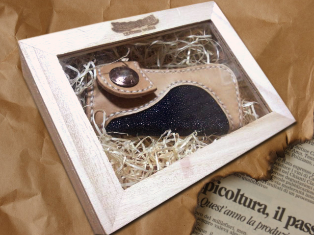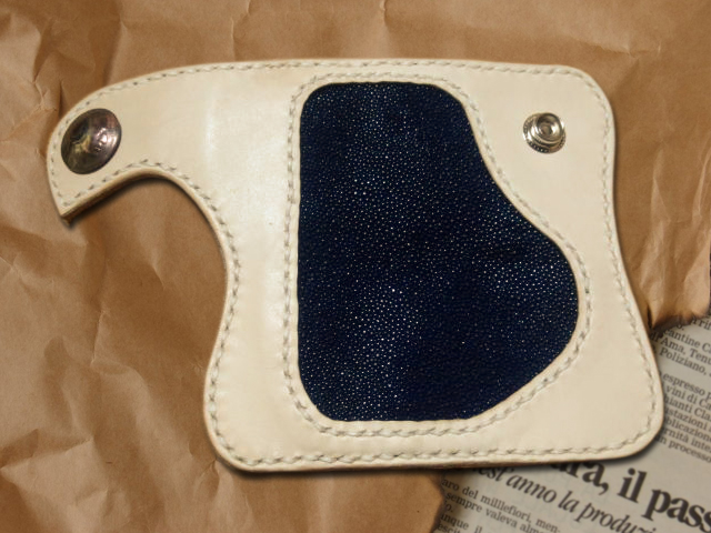 ナチュラルサドルレザーをベースに、ダークブルーのスティングレー(エイ革)をインレイさせたキーケースです。 GKH-001とペアでオーダーいただきました。 スティングレー(エイ革)はガラスビーズを一面に敷き詰めたような細かい突起が特徴的な革で、その強さは100年モノともいわれます。