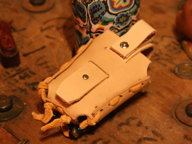ステッチは一切使用せず、リベットとディアスキンレース(鹿革のヒモ)の編み込みのみで制作してあります。