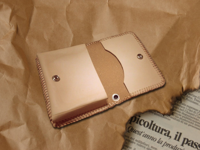 少し厚めの作りですが、ふちに革レースによる編み込みステッチを施しただけの、至ってシンプルなデザインの仕上がりです。