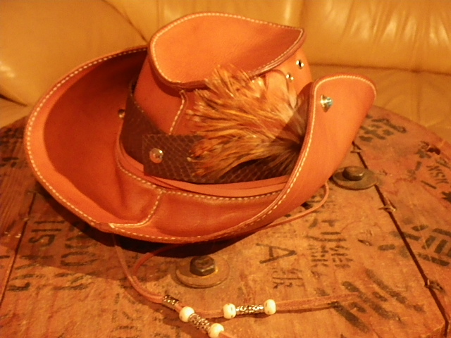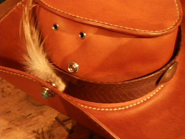 各パーツはオプションです。 ・ベルト(水蛇 ブラウン)+1,500円 ・フロントコンチョ +800円 ・サイドブリム固定ホック&ターコイズコンチョ +1,700円 ・渡り鳥フェザー +1,000円 ・あごひもカスタム(シルバー) +2,500円