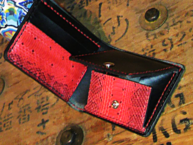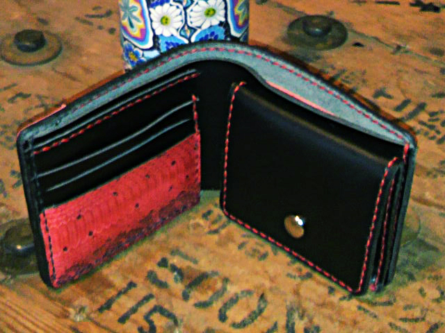 黒のサドルレザーをベースに、チェッカーをイメージした赤のレザーを縫い付けました。 中身は金運UPにとレッドパイソンでキメてます。 赤と黒の色使いがとてもかっこいい一品に仕上がっています。